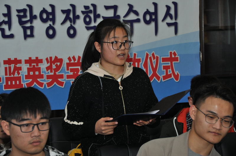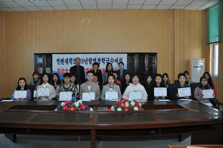 10月21日上午,我校2019年度“蓝英奖学金”发放仪式在二食堂就业教育与活动中心324室举行。延边大学学生工作部部长高斌、延边大学外国语学院党委副书记裴香花、延边大学教育基金会办公室副主任王洪国及获奖学生参加仪式。仪式由黄一娜主持。