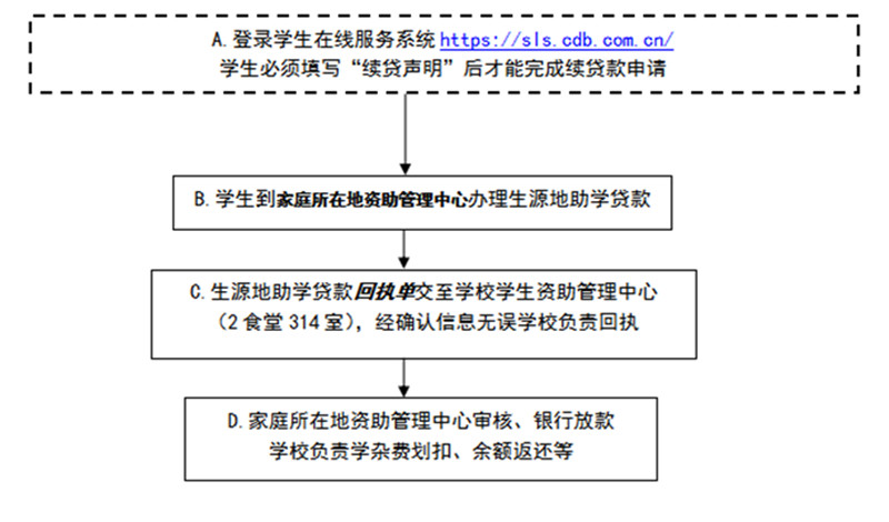 登录学生在线服务系统https://www.csls.cdb.com.cn/,填写“续贷声明”(截止时间:2017年6月底)后才能完成贷款申请。之后将①续贷申请书(见附件1);②成绩证明;③家庭所在地资助中心(家庭所在地教育局主管学生资助部门)开具的未开办生源地贷款业务的证明(加盖公章)等材料上报学校学生资助管理中心。